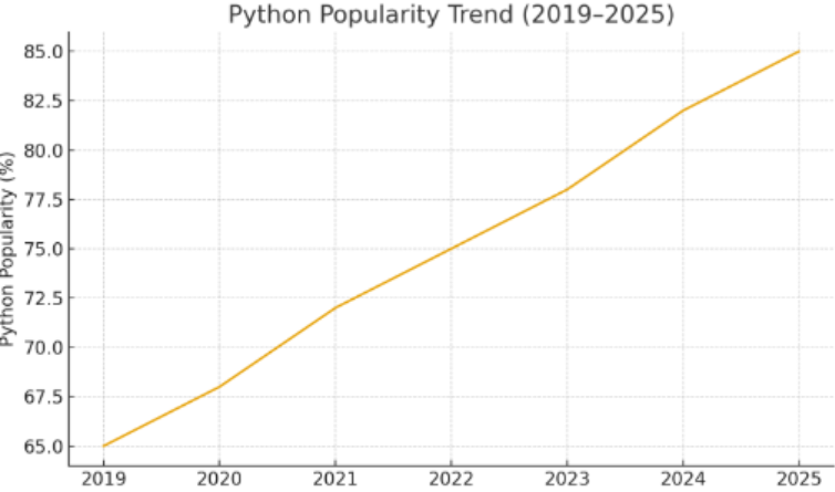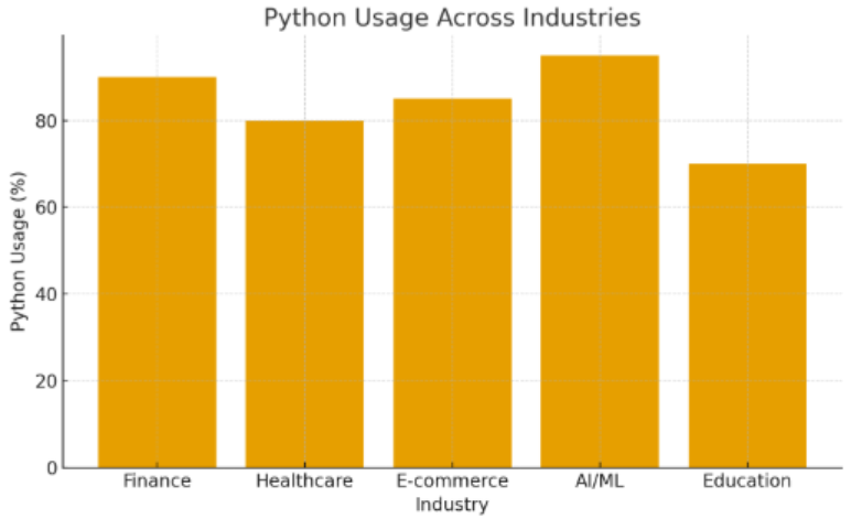 This graph highlights how widely Python is being used across major industries in 2025. By showing adoption in fields like finance, healthcare, e-commerce, AI/ML, and education, it gives readers a clear picture of Python’s real-world impact.