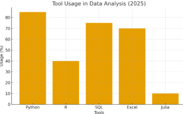 This graph gives readers a simple and clear comparison of the most used tools in data analysis—such as Python, Excel, SQL, and R. By placing these tools side by side, the chart helps even non-technical readers instantly see that: