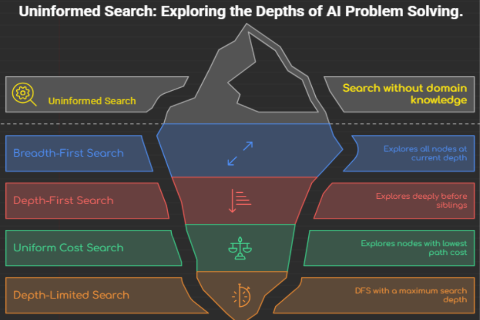 | Feature | Breadth-First Search (BFS) | Depth-First Search (DFS) | Uniform Cost Search (UCS) | Depth-Limited Search (DLS) |