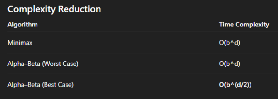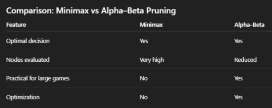 When α ≥ β at any node, prune that branch—MAX won’t pick a path MIN can force lower, saving massive computation while guaranteeing the same optimal result as full Minimax. (see the image above)