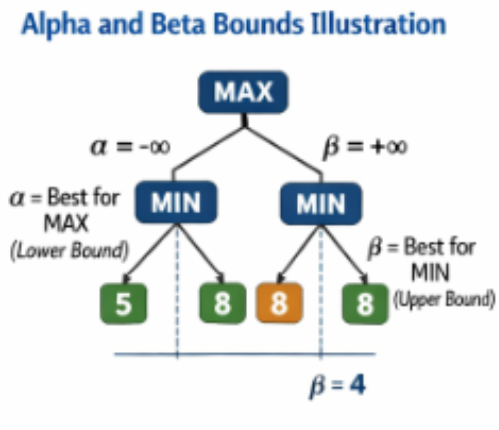 It tracks two bounds: Alpha (α), the best MAX score so far (won’t choose below it), and Beta (β), the best MIN score so far (won’t allow above it).