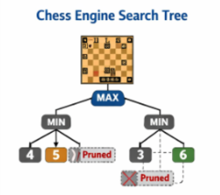 Alpha-Beta Pruning optimizes the Minimax algorithm for two-player zero-sum games like chess by skipping branches that won’t affect the final decision. (see the generated image above)
