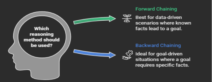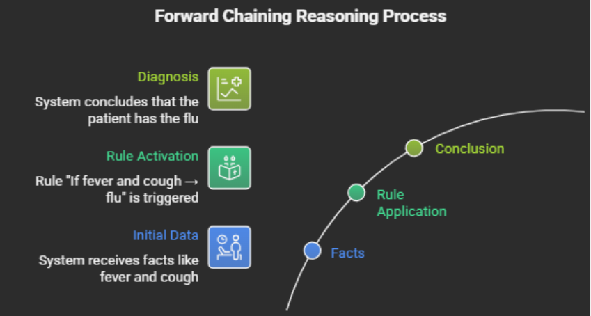 Forward chaining begins with the available facts and applies rules to derive new conclusions until the goal is reached.