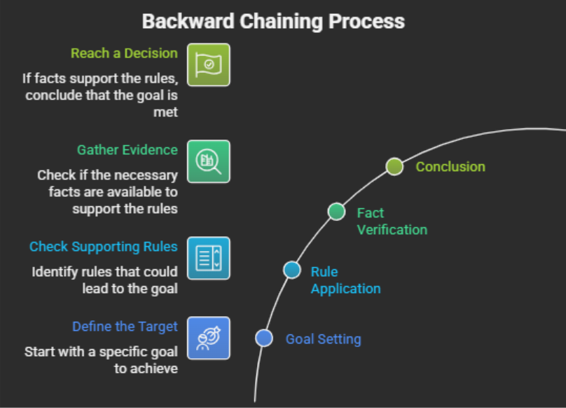 Backward chaining begins with a goal or hypothesis and works backward to verify whether the facts support it.