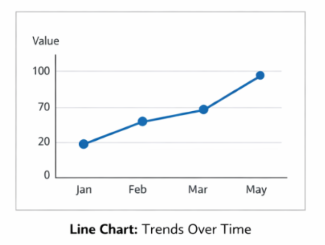 A line chart displays data points connected by straight lines. It is primarily used to show how values evolve over time, allowing viewers to observe trends, fluctuations, and long-term movement.