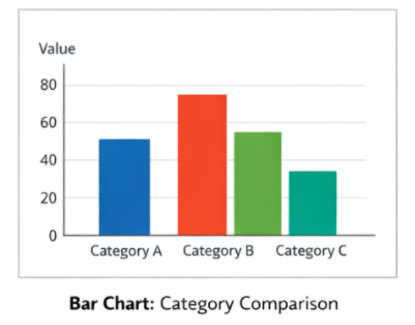 A bar chart uses rectangular bars to represent values across different categories. The length or height of each bar corresponds to the value it represents.